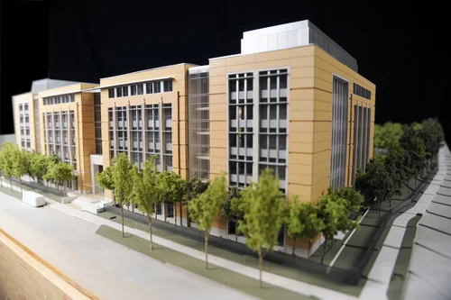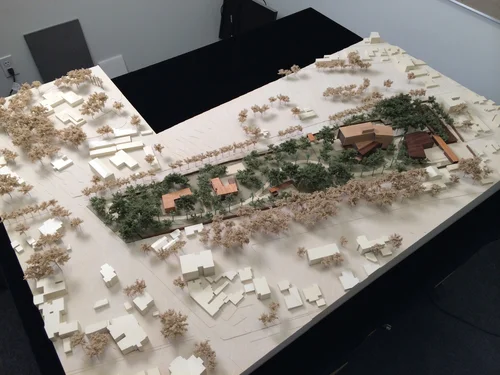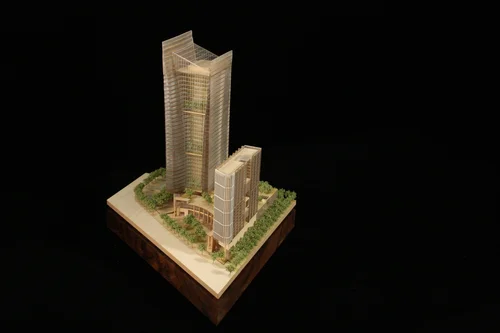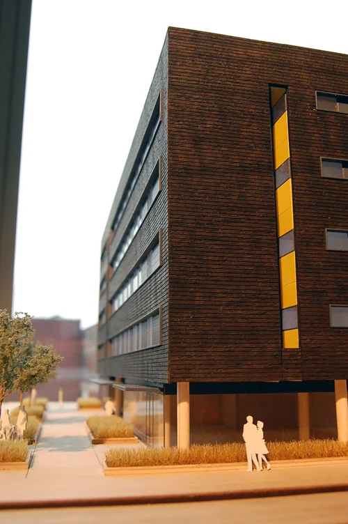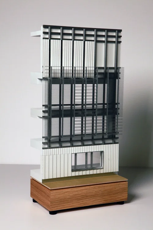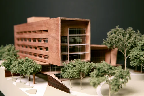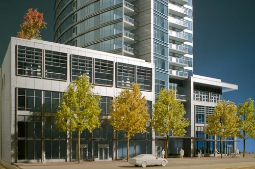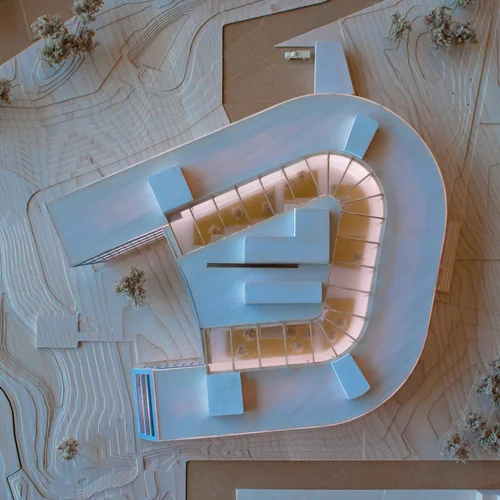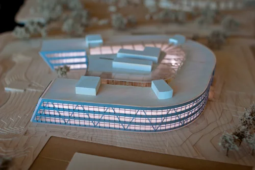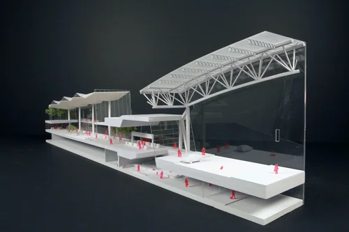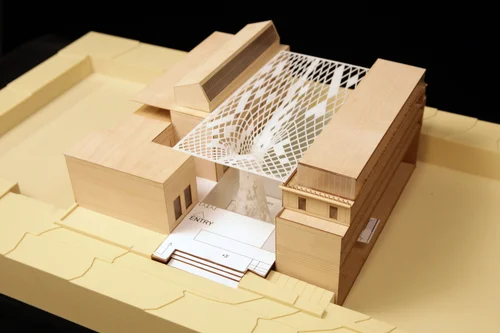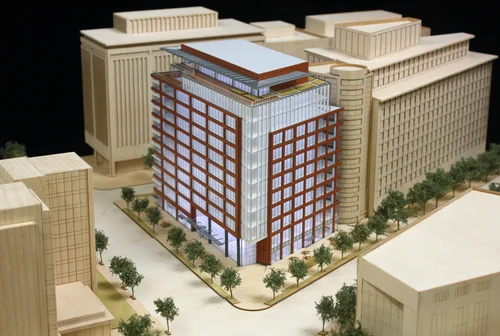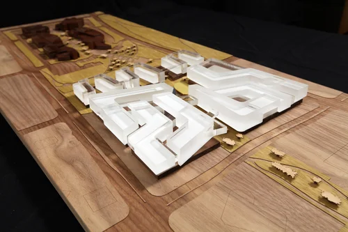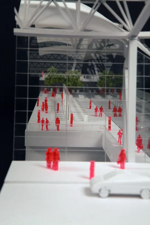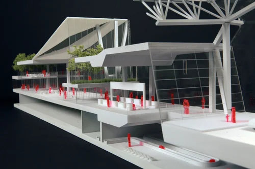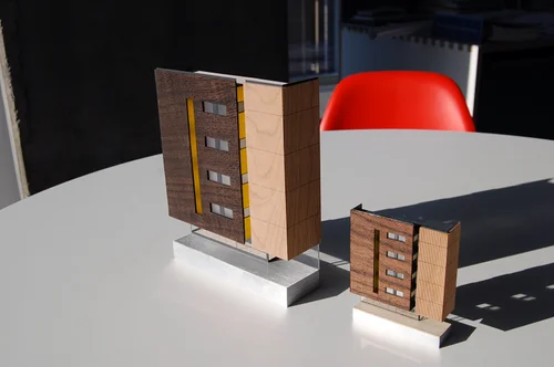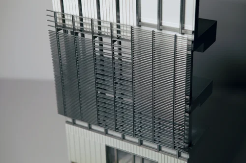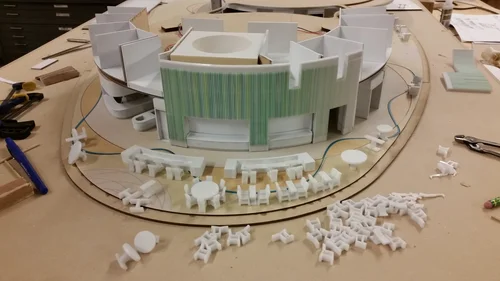 The shop was asked to come up with an interesting skin for an early design concept. We ended up printing on transparency to provide color, variation, and a sense of scale. Placing it behind the frosted skin allowed for a blurred and textured facade.