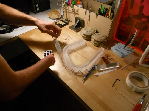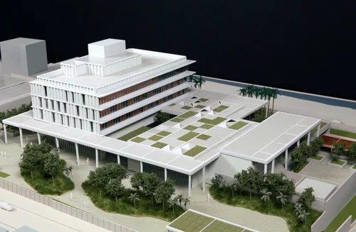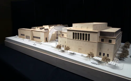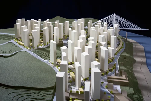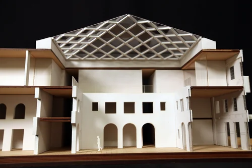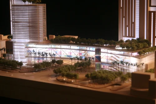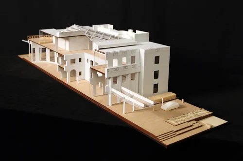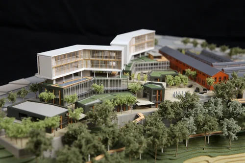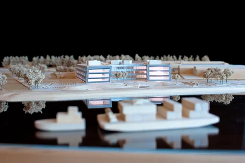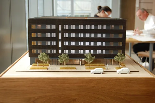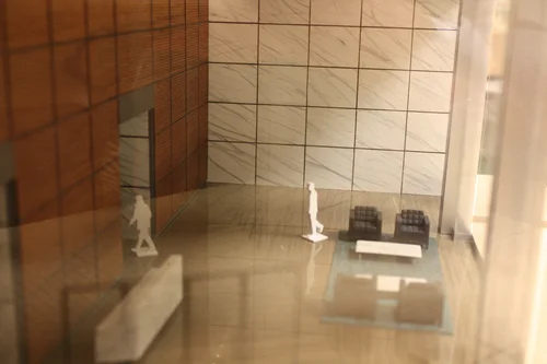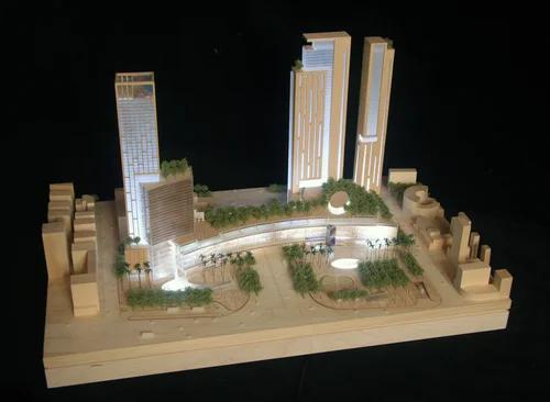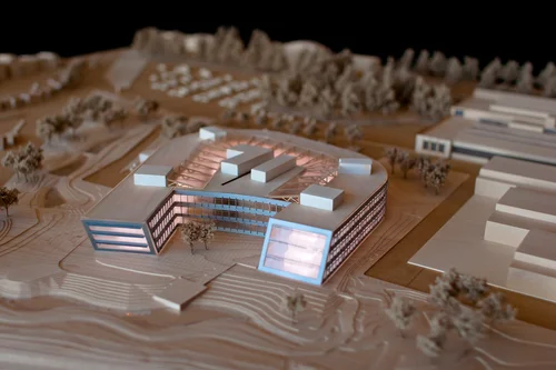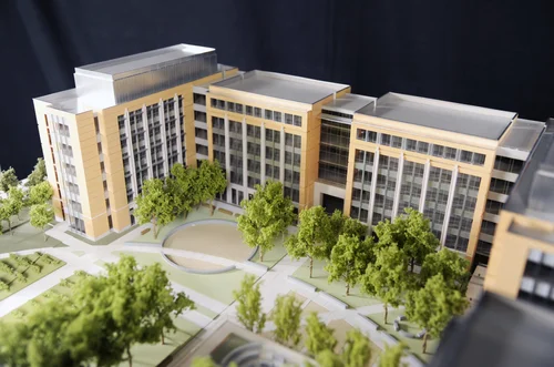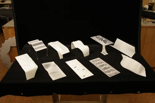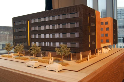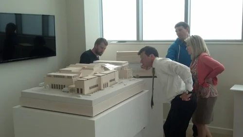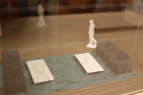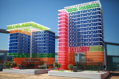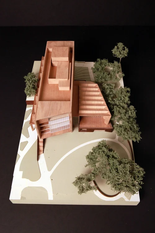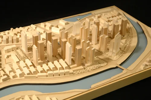 The shop was asked to come up with an interesting skin for an early design concept. We ended up printing on transparency to provide color, variation, and a sense of scale. Placing it behind the frosted skin allowed for a blurred and textured facade.